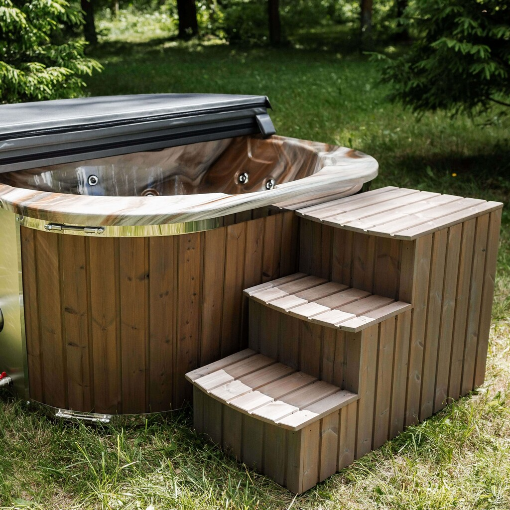 Jakuzinin dış kaplamasıyla birebir uyumlu, kaymaz yüzeyli ve geniş basamaklı tasarım. Hem şık bir bütünlük sunar hem de güvenli bir giriş-çıkış imkanı tanır.