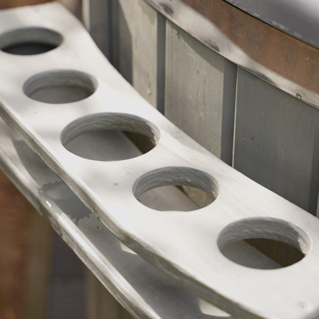İskandinav çamının sıcak dokusu ve paslanmaz çelik logo detayı. Zorlu hava koşullarına, neme ve güneşe karşı ekstra dirençli, bakım gerektirmeyen dış gövde.